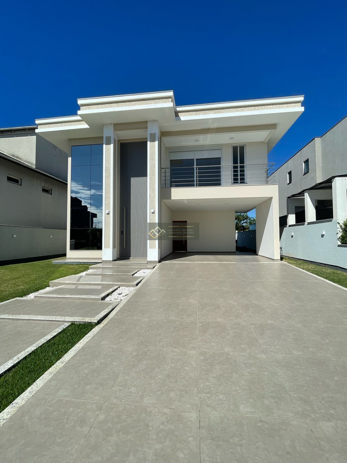 É uma casa com 200 metros quadrados, contendo no piso superior 3 suítes sendo uma master com sacada